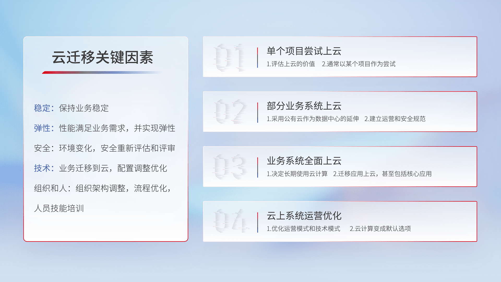 结合实际业务,,从规划设计、、、云平台选型、、、、云原生改造、、、数据迁移、、集成交付,,迁移全过程为客户识别最佳上云路径,,,做好风险识别管理,,设计网络架构、、、身份权限、、、、安全审计合规、、操作审计、、、日志审计、、监控告警策略、、多站点容灾设计等,,,对云上基础设施进行整体规划,,,,提升IT治理水平,,以满足弹性、、、、高可用、、、高性能的需求。。。