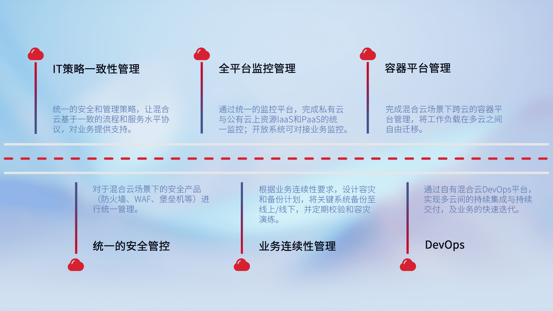 通过多云纳管,,以统一的资源数据模型把客户的云资源进行抽象和封装,,进而实现对多云资源的统一操作,,,,保障云资源管理的可靠性、、、、稳定性与可用性。。。。量身定制化运维内容,,配置、、、、开发运维、、、补丁管理、、、备份、、、监控、、认证和访问管理、、、、审计和日常巡检等,,保障在用云过程中的可靠度,,,,稳定度以及高可用率。。。