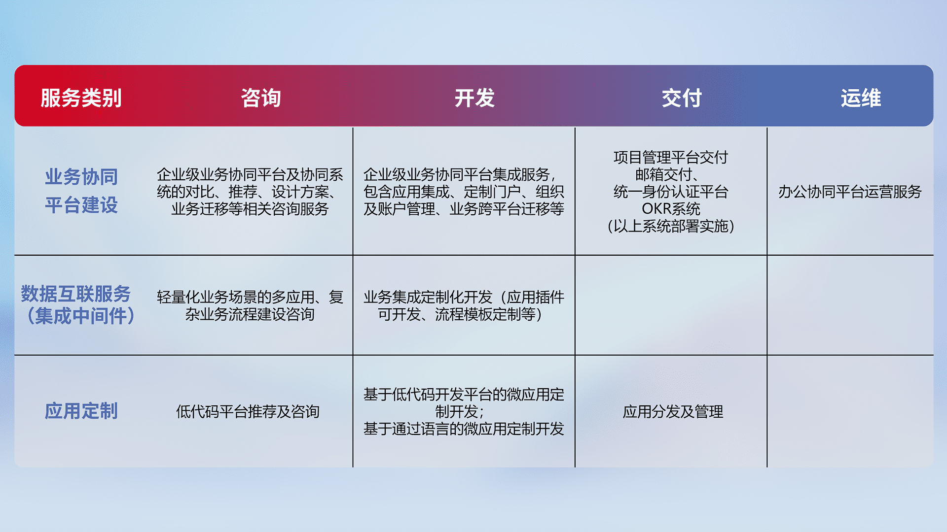 针对钉钉、、、企微、、、、IDaas等平台级产品提供产品的规划、、、方案、、交付、、、定制化开发等服务,,,实现如统一协同办公、、智能客户服务、、、、混合会议管理、、、、智能数据查询、、等业务场景,,,,实现数字化转型。。。